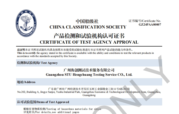 廣州衡創測試技術服務有限公司IHM實驗室是全球領先的覆蓋16項有害物質測試的一站式實驗室,經獲得中國船級社CCS等國內外船級社資質認可。船舶有害物質IHM調查服務依據EU 1257/2013歐盟法規、香港公約,提供船舶有害物質清單(IHM)調查、檢測、檢驗、認證服務。確保滿足公約同時引導船廠/船東滿足船級社發證及簽署IHM國際證書和國際適合拆船證書的要求。