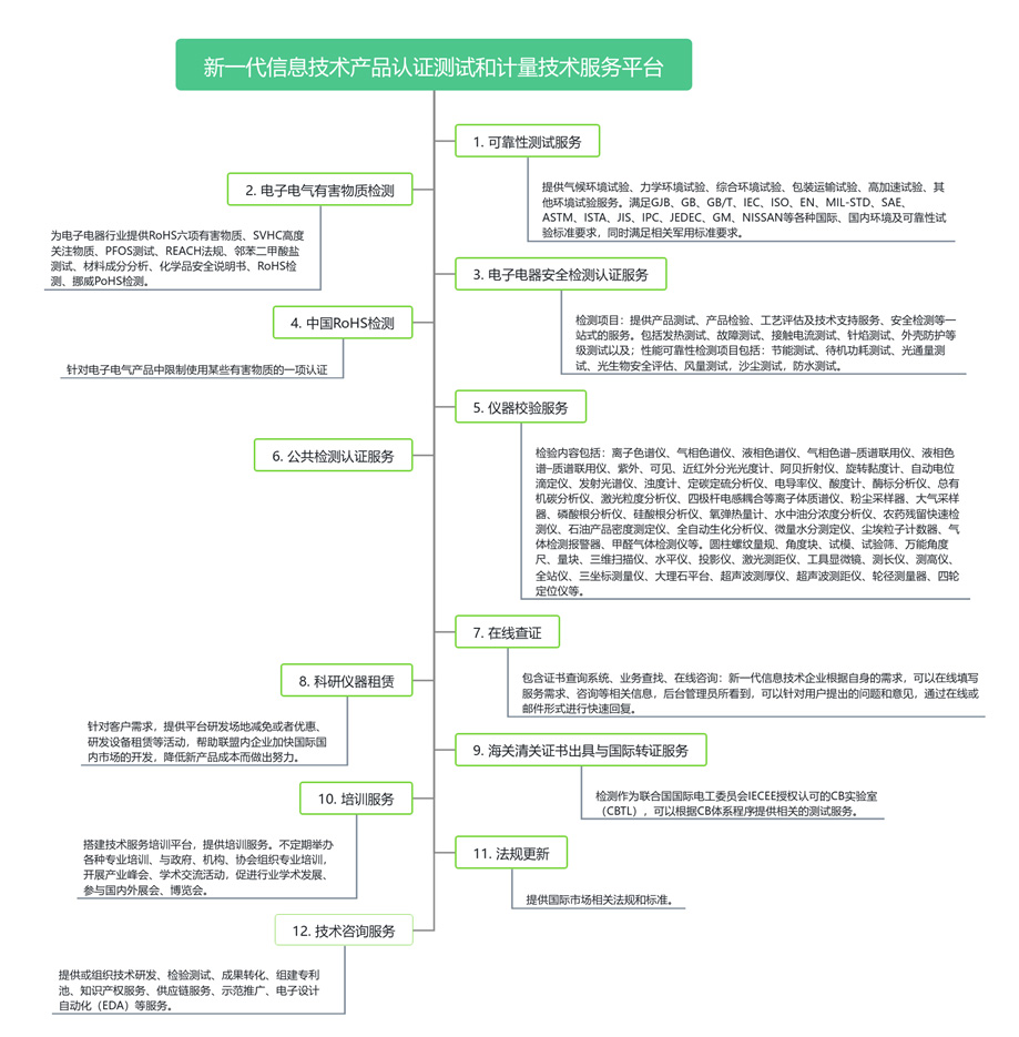 衡創新一代信息技術平臺通過打造"中國-挪威","中國-巴西",(中國-墨西哥)三大國家聯合實驗室,導入阿米巴+合伙人經營模式,在全球范圍內招才引智,以項目為導向,打造類孵化器式公共技術服務平臺,開展高端電子信息等產品產學研聯合,大型儀器共享,型式試驗,研發整改對策,法規貿易技術壁壘解讀,標準起草,測試儀器和輔助裝備研發,檢測工藝和檢測技術開發,認證測試,計量校準,國際轉證服務、驗貨服務、工廠審核,供應鏈管控服務、性能與可靠性測試、環境與健康檢測。
